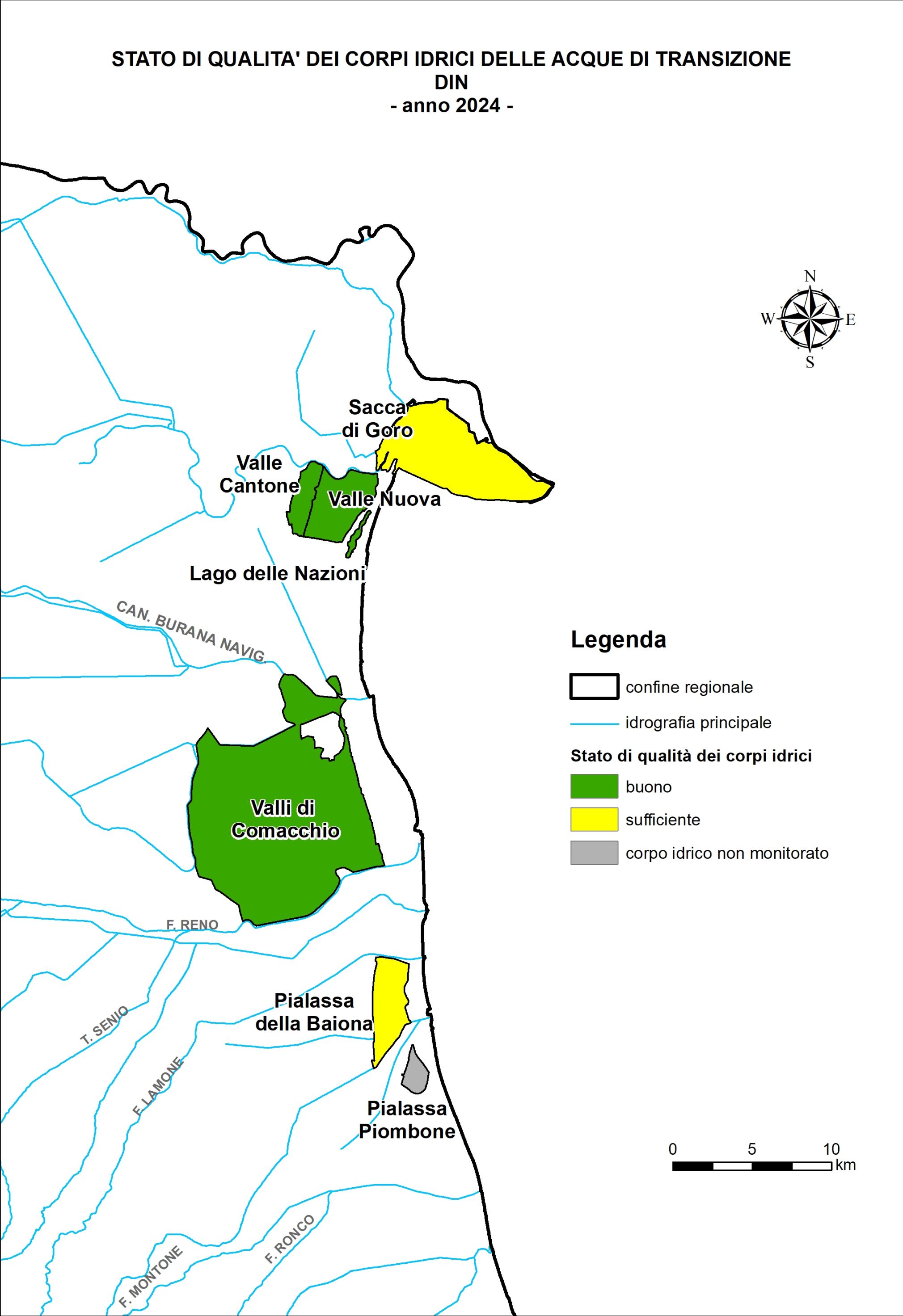 Nel 2024, lo stato è “sufficiente” per i corpi idrici per Sacca di Goro e Pialassa Baiona e “buono” per Valle Cantone, Valle Nuova, Lago delle Nazioni e Valli di Comacchio (figura 2).