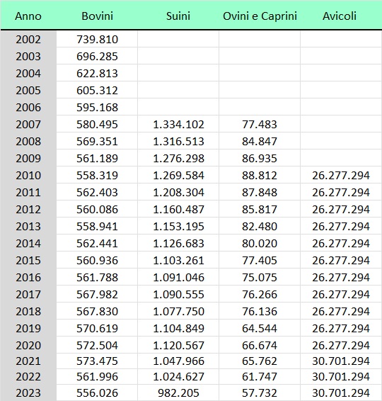 Numero totale di capi allevati in regione, distinto per specie (2002-2023)
