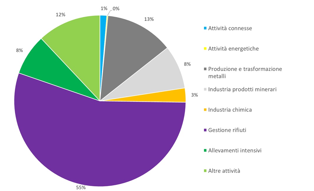 Ripartizione percentuale, per tipologia di attività, del numero di ispezioni effettuate nelle installazioni AIA (di competenza regionale), a livello regionale (2022)