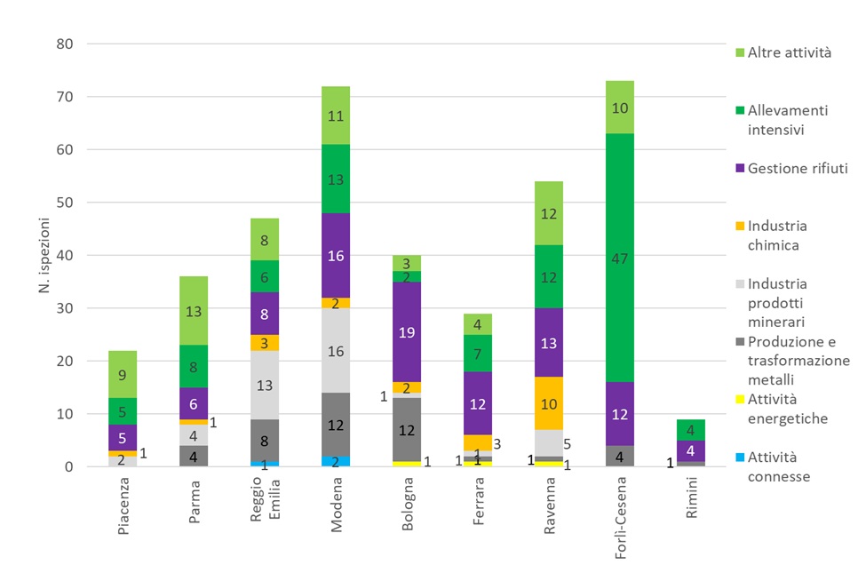 Numero di ispezioni effettuate nelle installazioni AIA (di competenza regionale), suddivise per provincia e per tipologia di attività (2021)