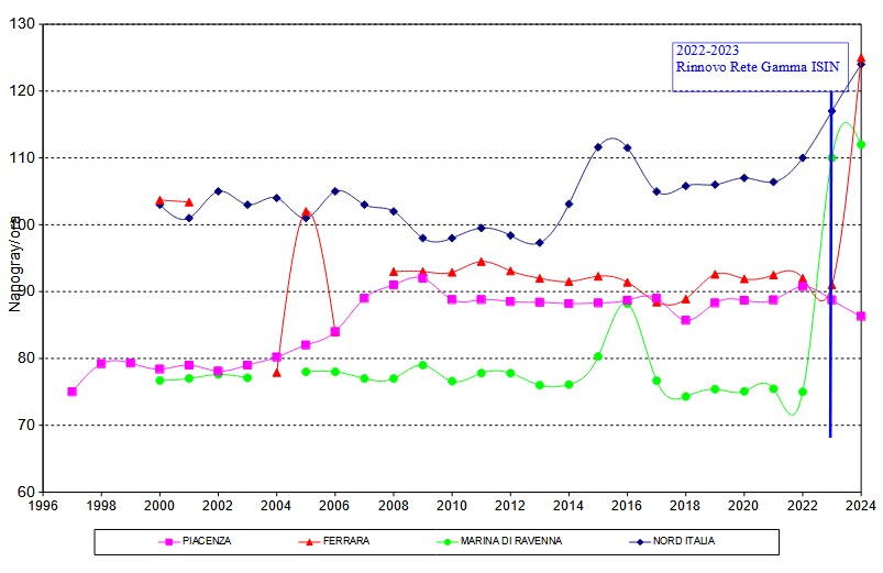 Intensità dose gamma assorbita in aria (outdoor) per esposizione a radiazione cosmica e terrestre, Emilia-Romagna (1997-2021)