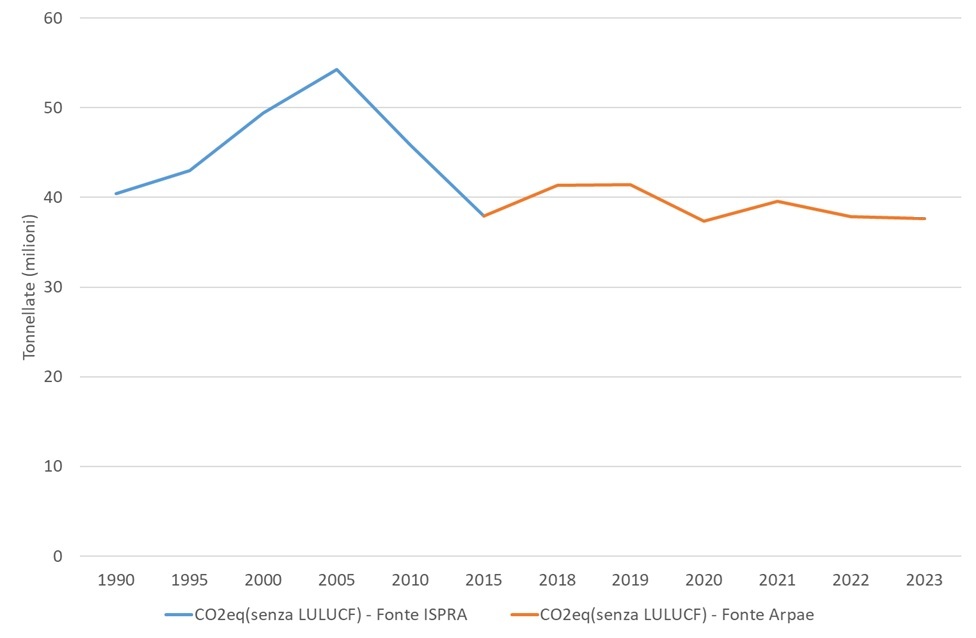 Le emissioni di gas serra in termini di CO2eq, al 2023, ammontano a 33.854 kt, considerando il contributo dagli assorbimenti, 37.425 kt al netto di questi. Nonostante il potere climalterante della CO2 sia inferiore rispetto a quello degli altri gas ad effetto serra, esso risulta essere il principale e più rilevante, contribuendo, praticamente, al 88% delle emissioni di CO2eq.