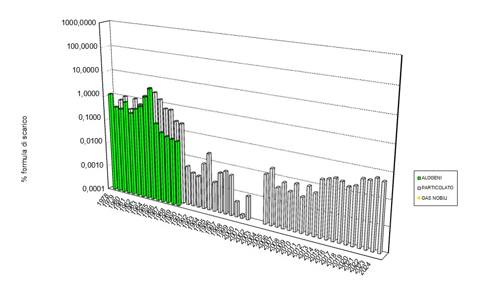 La centrale, pur in condizione di “disattivazione”, produce comunque scarichi liquidi e aeriformi (particolato): nel 2024 ad esempio gli scarichi liquidi ammontano a circa lo 9,44 E-03% della formula di scarico, mentre gli scarichi aeriformi a circa lo 4,78 E-02%. Tale produzione, pur rimanendo per gli aeriformi e i liquidi dell’ordine di qualche percentuale della formula di scarico negli anni di funzionamento dell’impianto, si è comunque progressivamente ridotta dal 1986, anno da cui la centrale è ferma, di circa 2-4 ordini di grandezza.