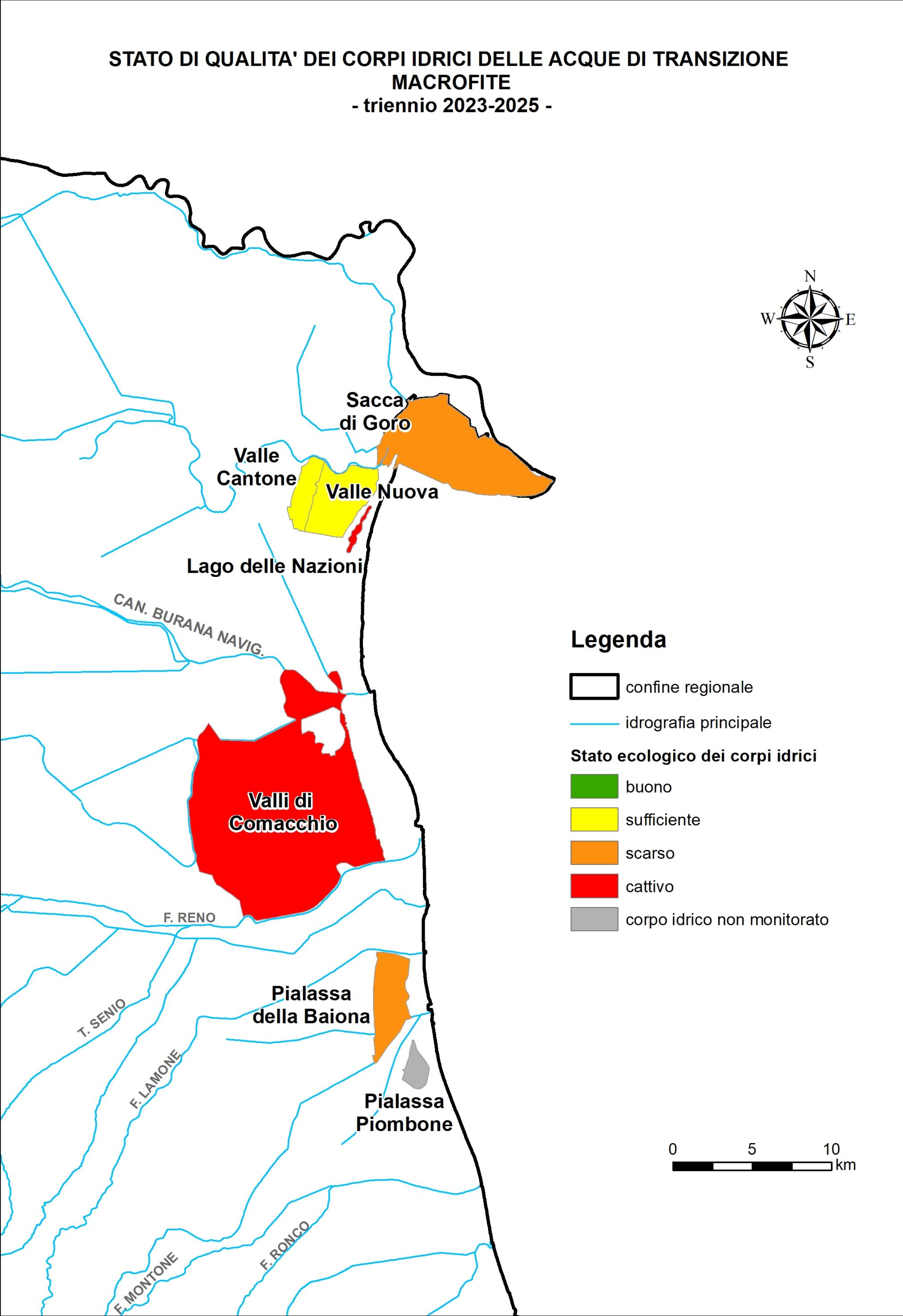 La valutazione dello stato di qualità, per il triennio 2023-2025, è risultata essere “sufficiente” per Valle Cantone e Valle Nuova, “scarsa” per Sacca di Goro e Pialassa Baiona, “cattiva” per Lago delle Nazioni e Valli di Comacchio (tabella 1 e figura 1).