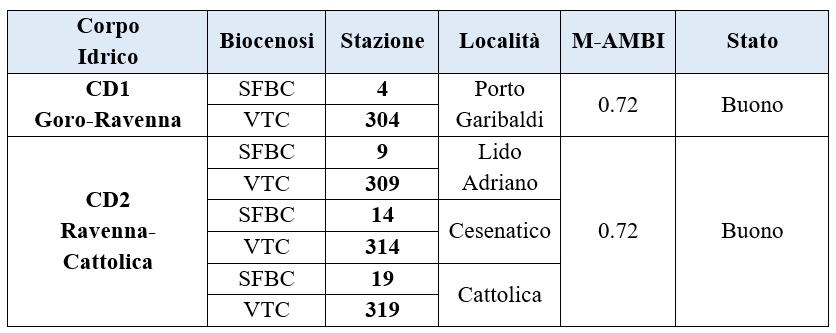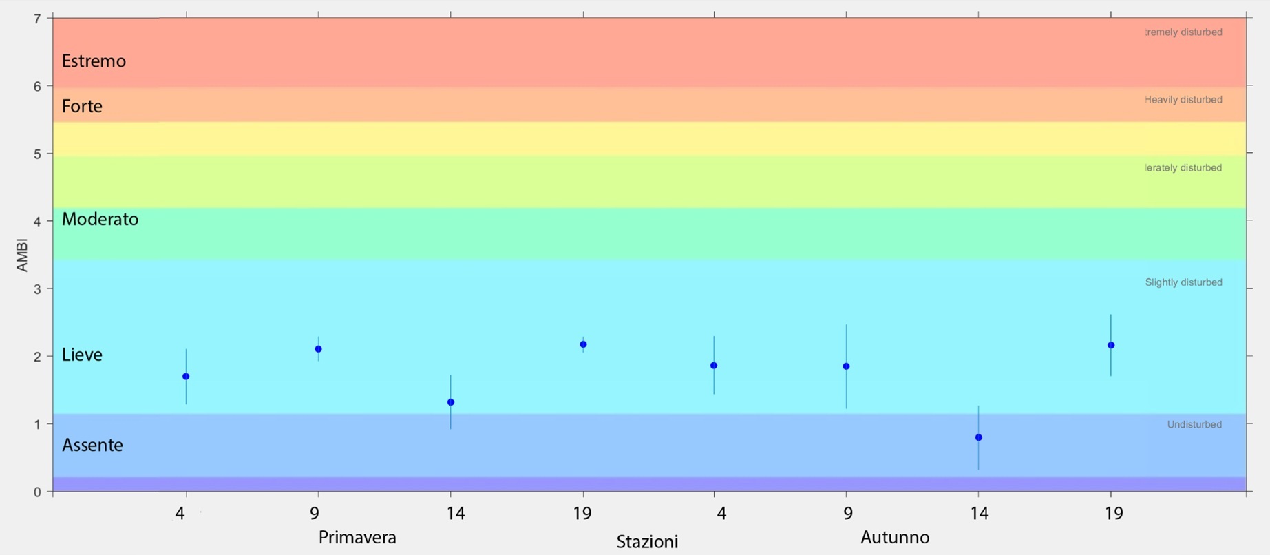 Valori stagionali dell’indice AMBI per le stazioni delle biocenosi SFBC (2014); LEGENDA: I= inverno, P= primavera, E= estate, A= autunno