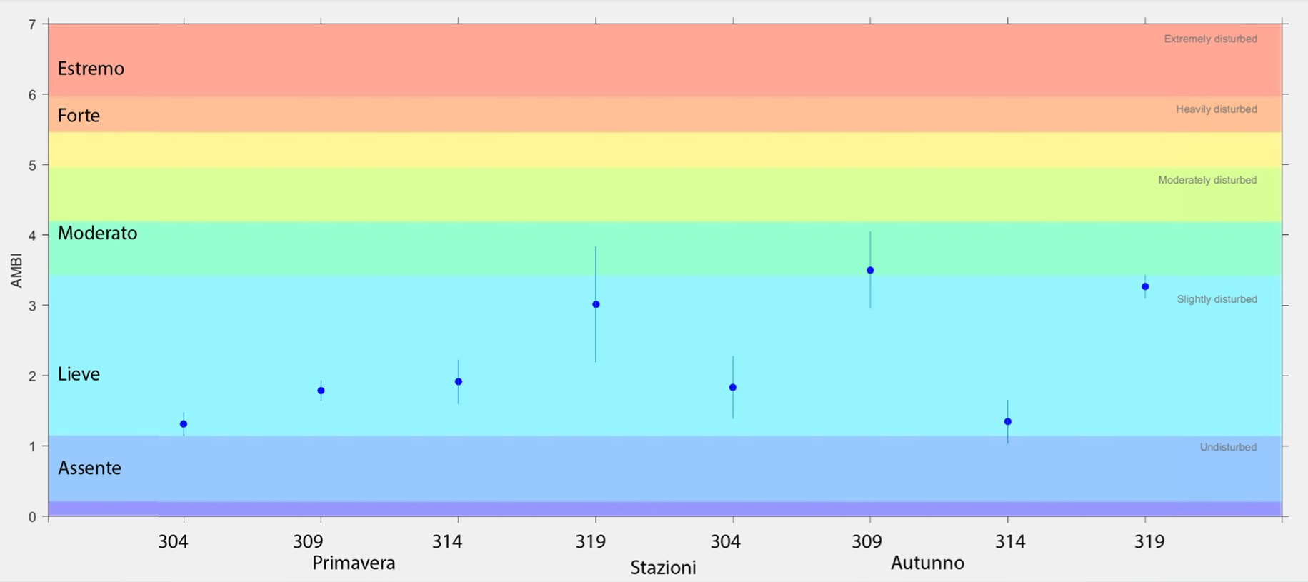 In figura 1 e in figura 2 sono presentati i valori dell’indice biotico AMBI, basato sulla presenza di specie appartenenti a gruppi ecologici a differente sensibilità nei confronti dell'inquinamento; questo indice varia in modo continuo da 0 (condizione di assenza di disturbo) a 6 (condizione di estremo disturbo). Le stazioni indagate sono quelle appartenenti alla biocenosi delle Sabbie Fini Ben Calibrate (SFBC), ubicate a circa 1 km dalla costa, e quelle dei Fanghi Terrigeni Costieri (VTC), distanti 3 km dalla costa. Il campionamento del sedimento, per l’indagine della comunità macrobentonica, è semestrale (primavera e autunno).
