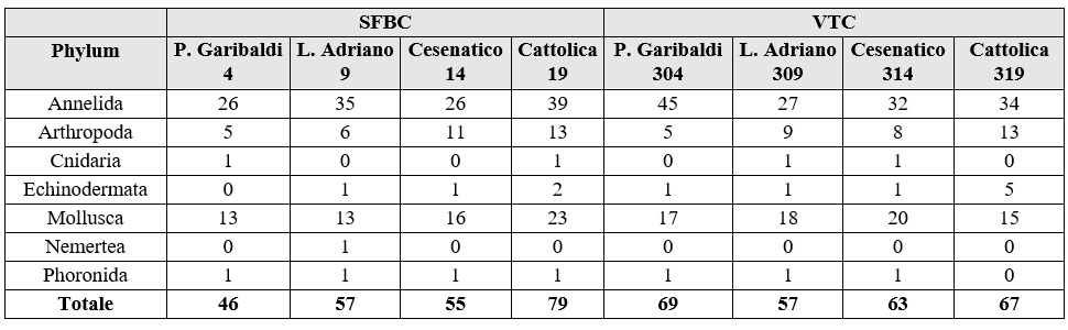 La maggior parte delle stazioni appartenenti alla biocenosi delle SFBC (figura 1) presentano un grado di disturbo lieve sia in primavera che in autunno, ad eccezione della stazione 14 che presenta un grado di disturbo assente in autunno. Per quanto riguarda le stazioni appartenenti alla biocenosi delle VTC (figura 2), si riscontra un grado di disturbo lieve sia in primavera che in autunno, ad eccezione della stazione 309 che presenta un grado di disturbo moderato in autunno.  Le stazioni in cui è stato rinvenuto il maggior numero di specie sono Cattolica, con 79 specie per le SFBC, e Porto Garibaldi, con 69 specie per le VTC. Il minor numero di specie rinvenuto è registrato a Porto Garibaldi, con 46 specie nelle stazioni SFBC, e a Lido Adriano, con 57 specie per le VTC. I Phylum che maggiormente contribuiscono alla definizione delle comunità bentoniche sono quello degli Anellida e quello dei Mollusca (tabella1).