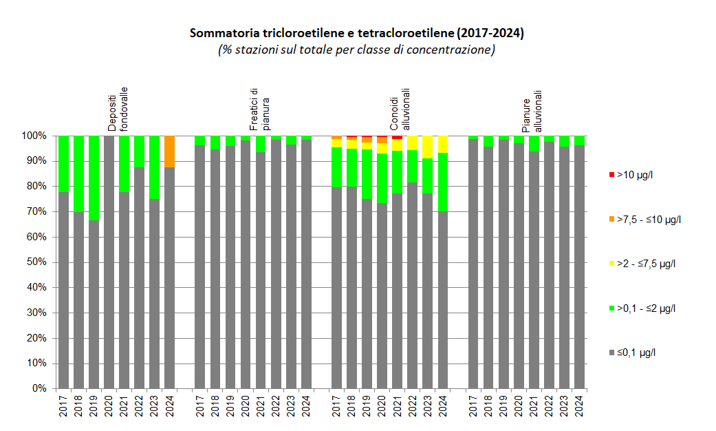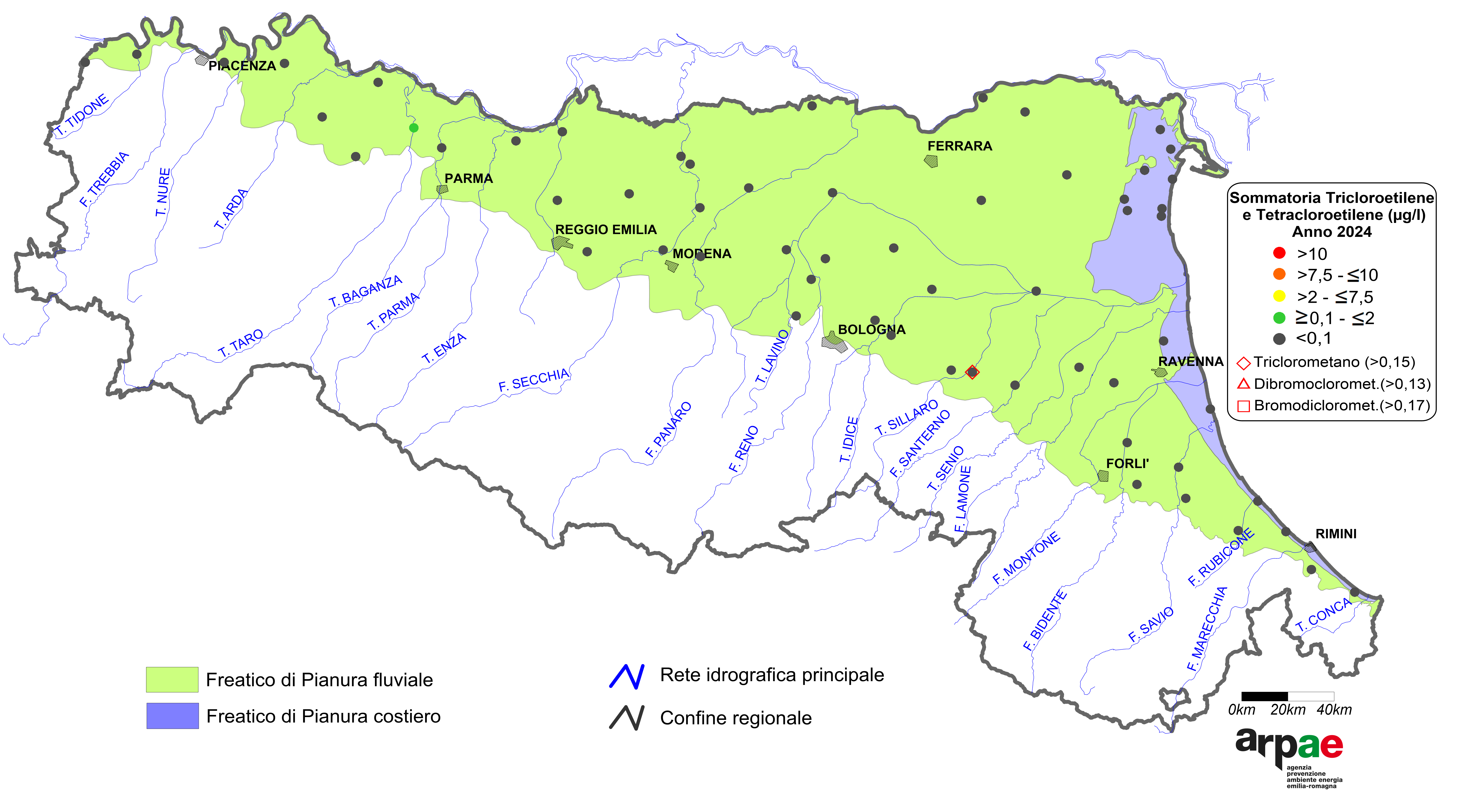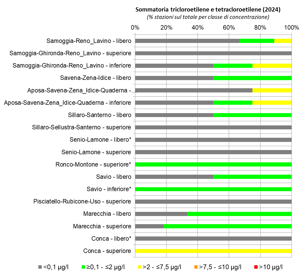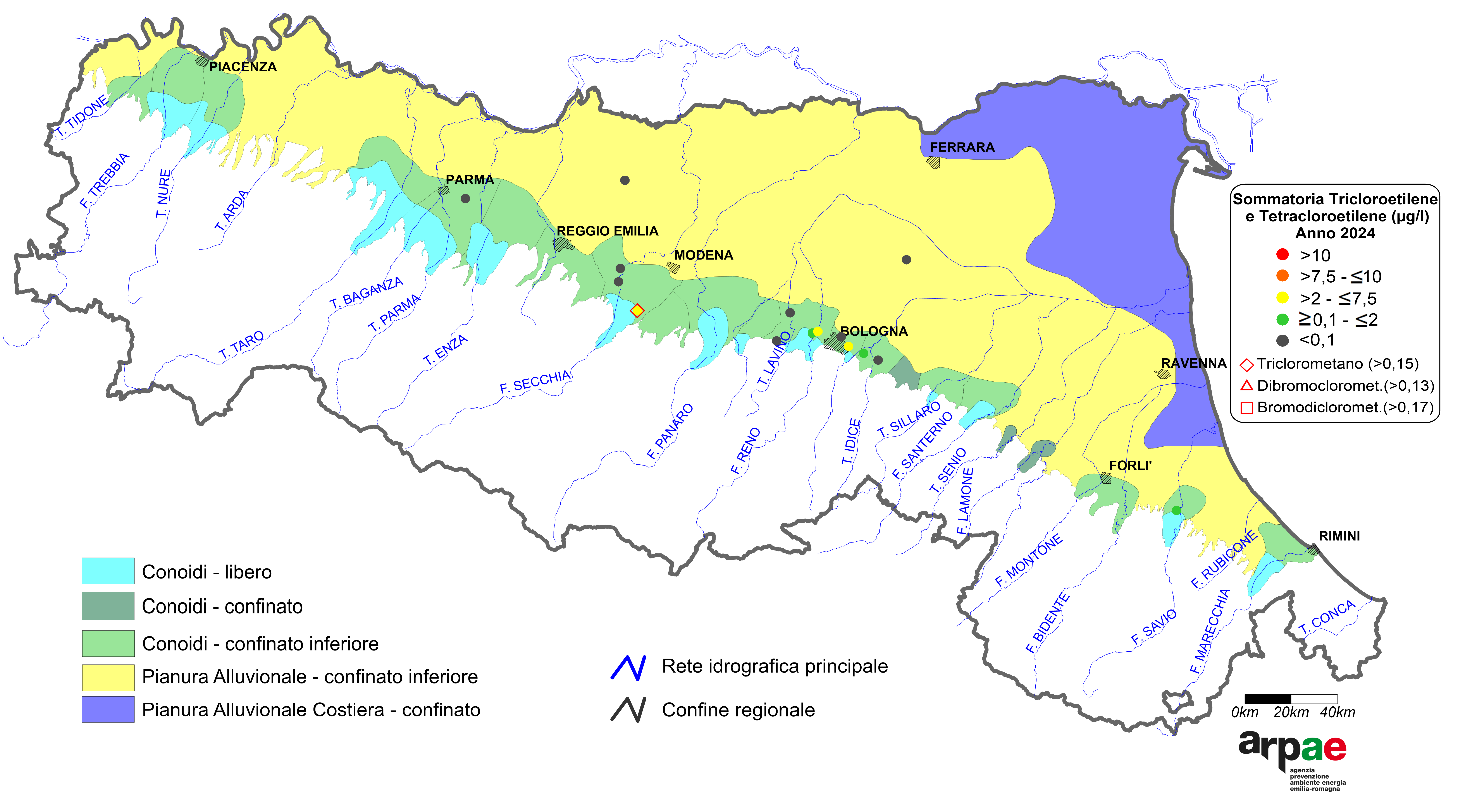 Nel monitoraggio 2024 i composti organoalogenati sono stati determinati su 246 stazioni di monitoraggio, di cui 234, pari al 94,7% del totale, non presentano superamenti dei limiti normativi, mentre in 13 stazioni (5,3% del totale) si hanno superamenti della media annua di una o più delle seguenti sostanze: Triclorometano, Dibromoclorometano, Bromodiclorometano. La sommatoria media annua di Tricloroetilene e Tetracloroetilene rientra sempre nel limite normativo in tutte le stazioni di monitoraggio ed ha una concentrazione compresa tra 2 μg/l e 7,5 μg/l in 10 stazioni ubicate nelle Conoidi emiliane di Parma, Modena e Bologna e nelle Conoidi romagnole del riminese, tra 0,1 μg/l e 2 μg/l in 37 stazioni ubicate principalmente nelle Conoidi Appenniniche, mentre l'80,5% delle stazioni ha una concentrazione inferiore a 0,1 μg/l, che rappresenta il limite di quantificazione della metodica analitica per le due sostanze (figura 1).