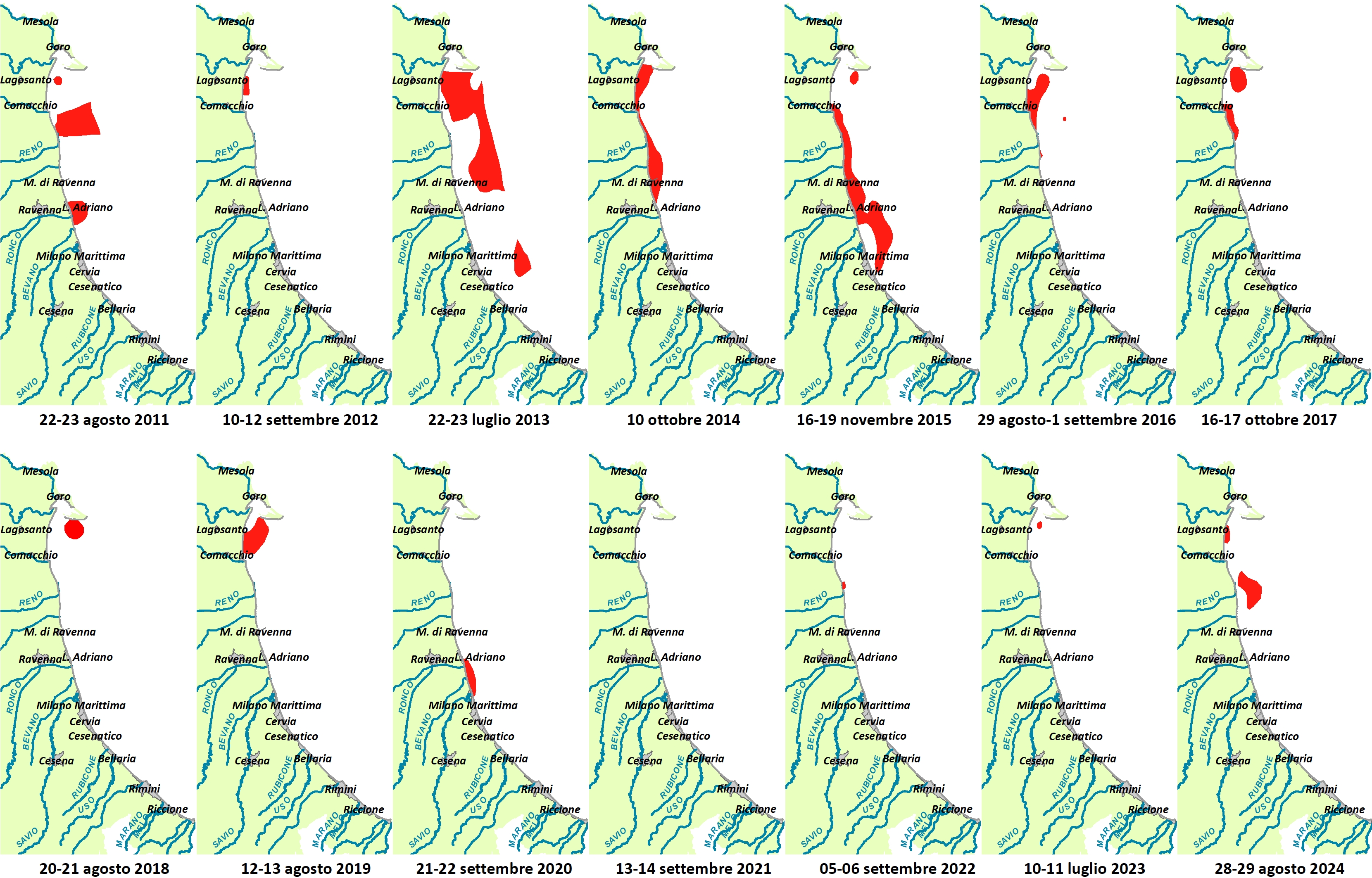 Mappe di distribuzione delle condizioni anossiche delle acque di fondo da costa fino a 10 km al largo (2011-2024)