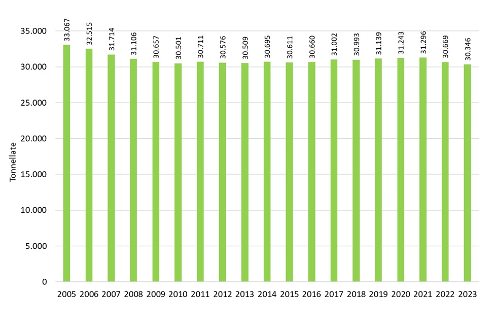 Quantitativi di azoto (tonnellate) derivanti dagli effluenti degli allevamenti bovini dell'Emilia-Romagna (2005-2023)