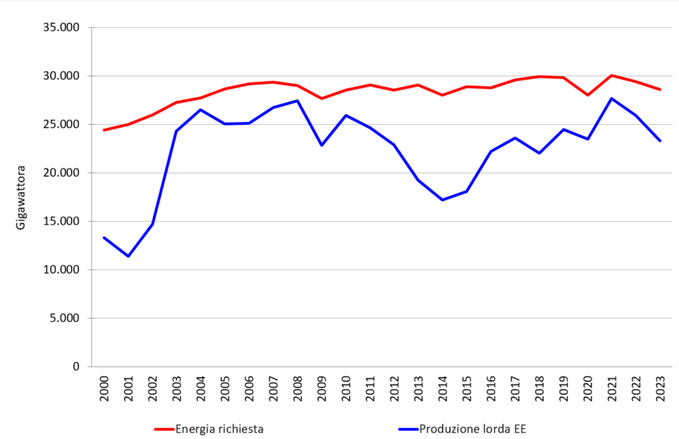 Analizzando la serie storica, si osserva che la produzione di energia elettrica ha invertito il trend decrescente a partire dal 2015, dopo una riduzione complessiva del 37% nel periodo 2008-2014. Il valore di produzione di energia elettrica lorda, nel 2023, risulta superiore di circa il 35,4% al valore registrato nel 2014, minimo riscontrato relativamente al periodo 2013-2023.