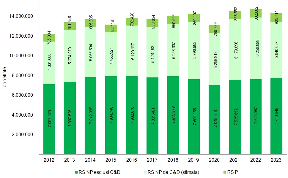 Il grafico di figura 1 riporta il trend della produzione di RS, esclusi i C&D, dal 2012 al 2023.
