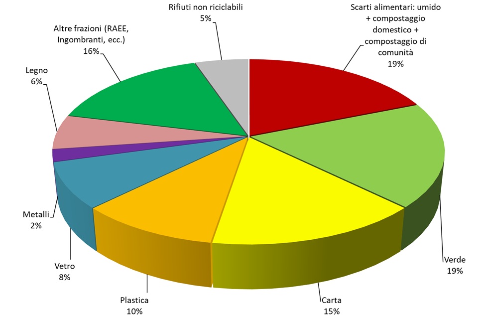La composizione merceologica media dei rifiuti urbani prodotti in regione nel 2024 (figura 3) è stata ricostruita sommando a ciascuna frazione contenuta nei rifiuti indifferenziati residui la stessa frazione oggetto di raccolta differenziata effettuata dal gestore, proveniente dal medesimo bacino di utenza.