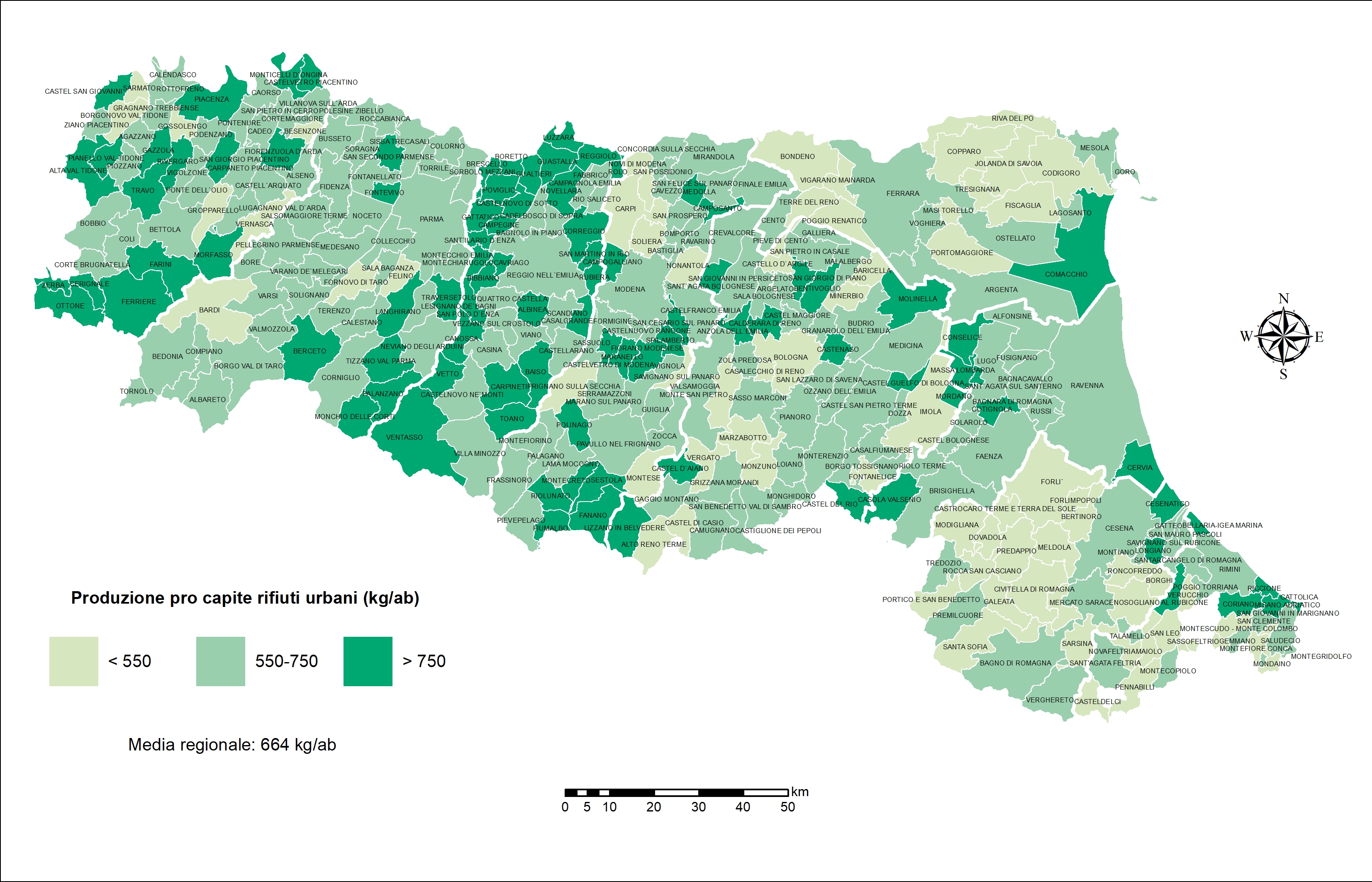 Rappresentazione grafica della produzione pro capite di rifiuti urbani per comune (2015)