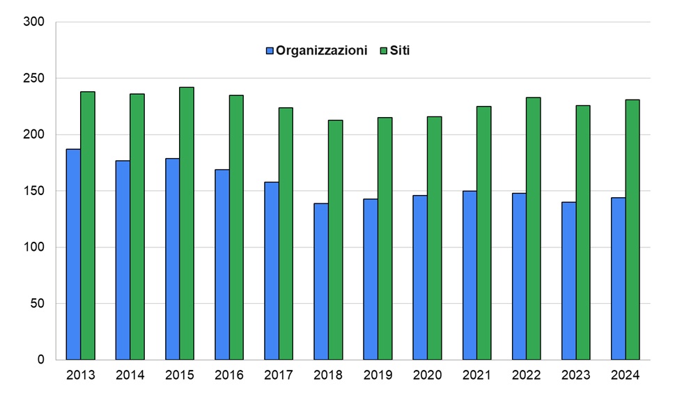 N. di registrazioni EMAS rilasciate ad organizzazioni e siti in Emilia-Romagna, andamento temporale (2013-2024)