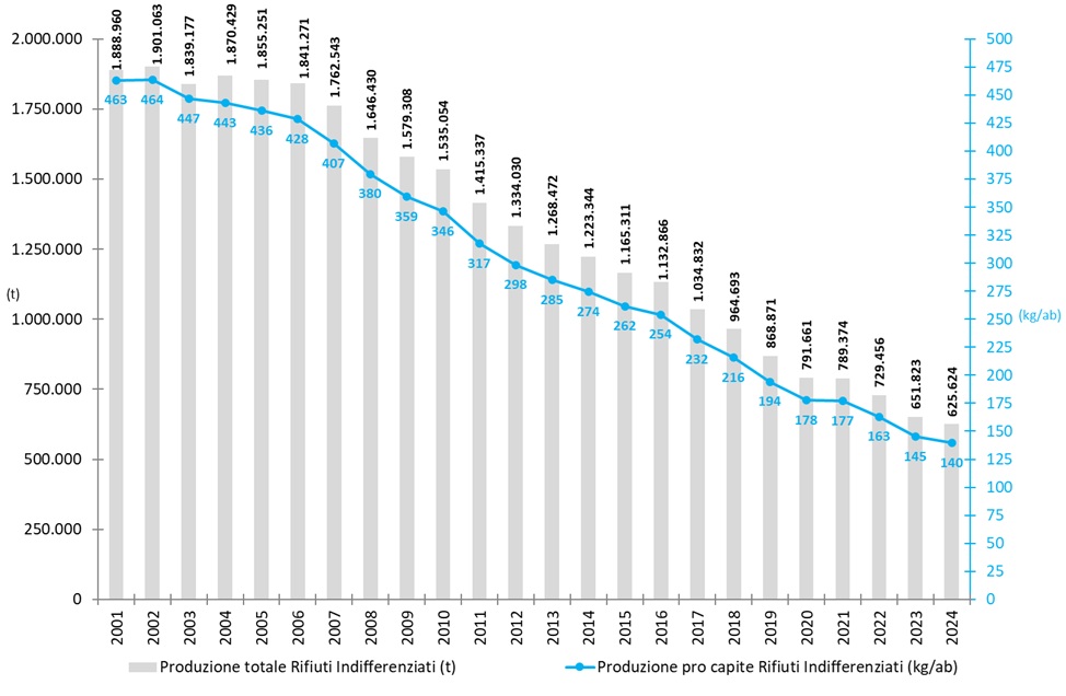 I rifiuti urbani indifferenziati complessivamente prodotti nel 2024 ammontano a 625.624 tonnellate; la produzione pro capite è stata di 140 kg/ab.