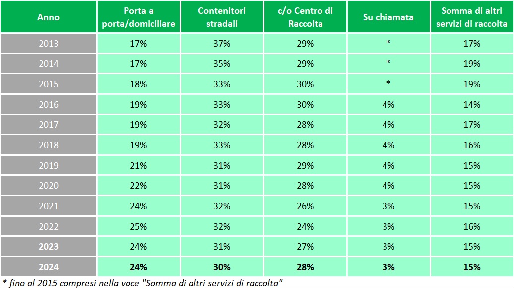 Nel 2024, il sistema di raccolta differenziata (effettuata dai gestori del servizio) tradizionalmente più diffuso, a livello regionale, continua ad essere quello con contenitori stradali, che intercetta il 30% della raccolta differenziata, seguito dai centri di raccolta, con il 28%, e dalla raccolta porta a porta/domiciliare, con il 24%; inoltre, sono il 3% i rifiuti raccolti su chiamata/prenotazione da parte dell'utente, mentre il 15% corrisponde alla somma di tutti gli “altri sistemi di raccolta”. Rispetto al 2023 le differenze sono minime.