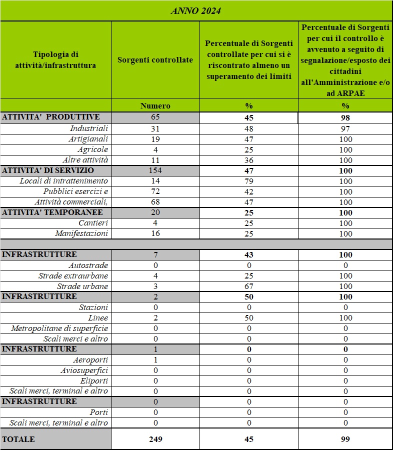 L’indicatore descrive l’attività di controllo (con misurazioni) del rispetto dei limiti vigenti in ambiente esterno e/o all’interno degli ambienti abitativi (L 447/95), esplicata da parte di Arpae Emilia-Romagna, con distinzione fra le diverse tipologie di sorgenti (attività produttive, attività di servizio e/o commerciali, cantieri, manifestazioni temporanee ricreative, strade, ferrovie etc.), evidenziando le situazioni di non conformità in termini di percentuale di sorgenti controllate per cui si è riscontrato almeno un superamento dei limiti fissati dalla normativa.
