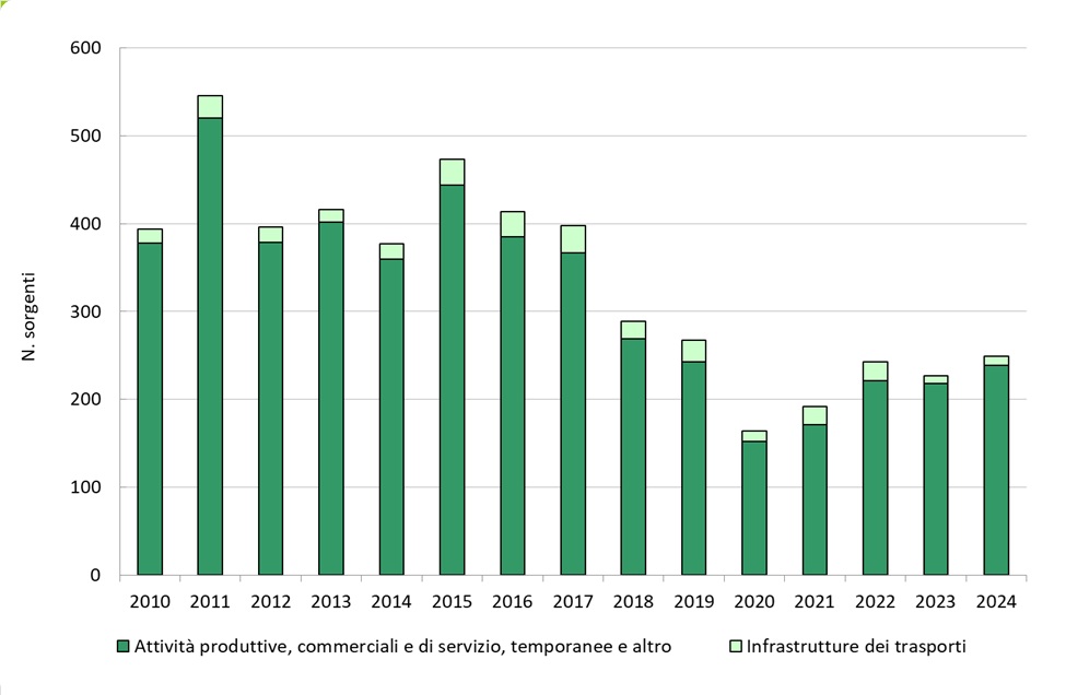 Le sorgenti controllate nel 2024 risultano complessivamente pari a 249, con un aumento del 10% rispetto all’anno 2023 (figura 1): i numeri risultano in lieve diminuzione rispetto agli anni pre Covid (ad es. -7% rispetto al 2019).
