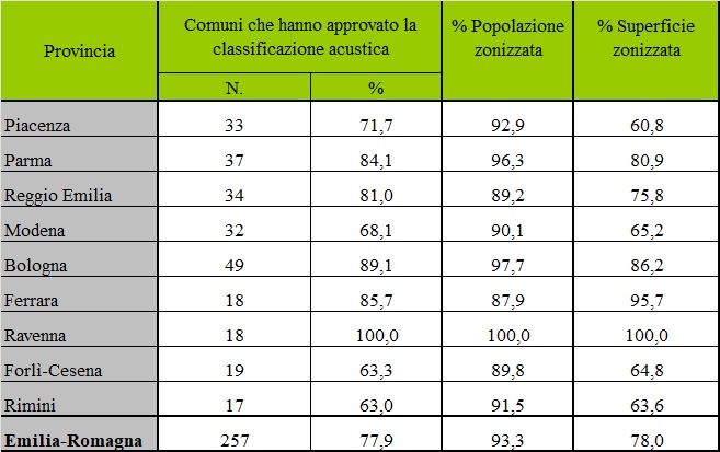 È inoltre necessario rimarcare che, se in Emilia-Romagna - con il 22% dei Comuni che ancora debbono approvare la classificazione acustica - si è ancora lontani dal soddisfare pienamente questo specifico obbligo di legge, in altre Regioni (Valle d’Aosta, Marche, Toscana, Lombardia, Veneto) il processo di classificazione acustica del territorio è quasi completato (percentuale di comuni zonizzati > 90%).