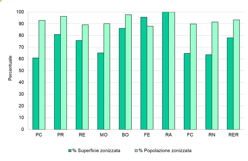 Dai dati disponibili presso Arpae, riportati nelle tabelle 1 e 2, risulta che al 31/12/2024 il numero di comuni zonizzati è aumentato di una unità rispetto al 2023: a livello regionale 257 dei 330 Comuni della regione, il 77,9% del totale, hanno approvato la classificazione acustica del territorio ai sensi della LR 15/01, ovvero della L 447/95 o del DPCM 01/03/91 (queste ultime classificazioni da adeguare ai sensi della LR 15/01). La percentuale di territorio zonizzato è il 78% del territorio regionale, tuttavia, la popolazione che risiede in territori zonizzati è oltre il 93,3% del totale regionale.