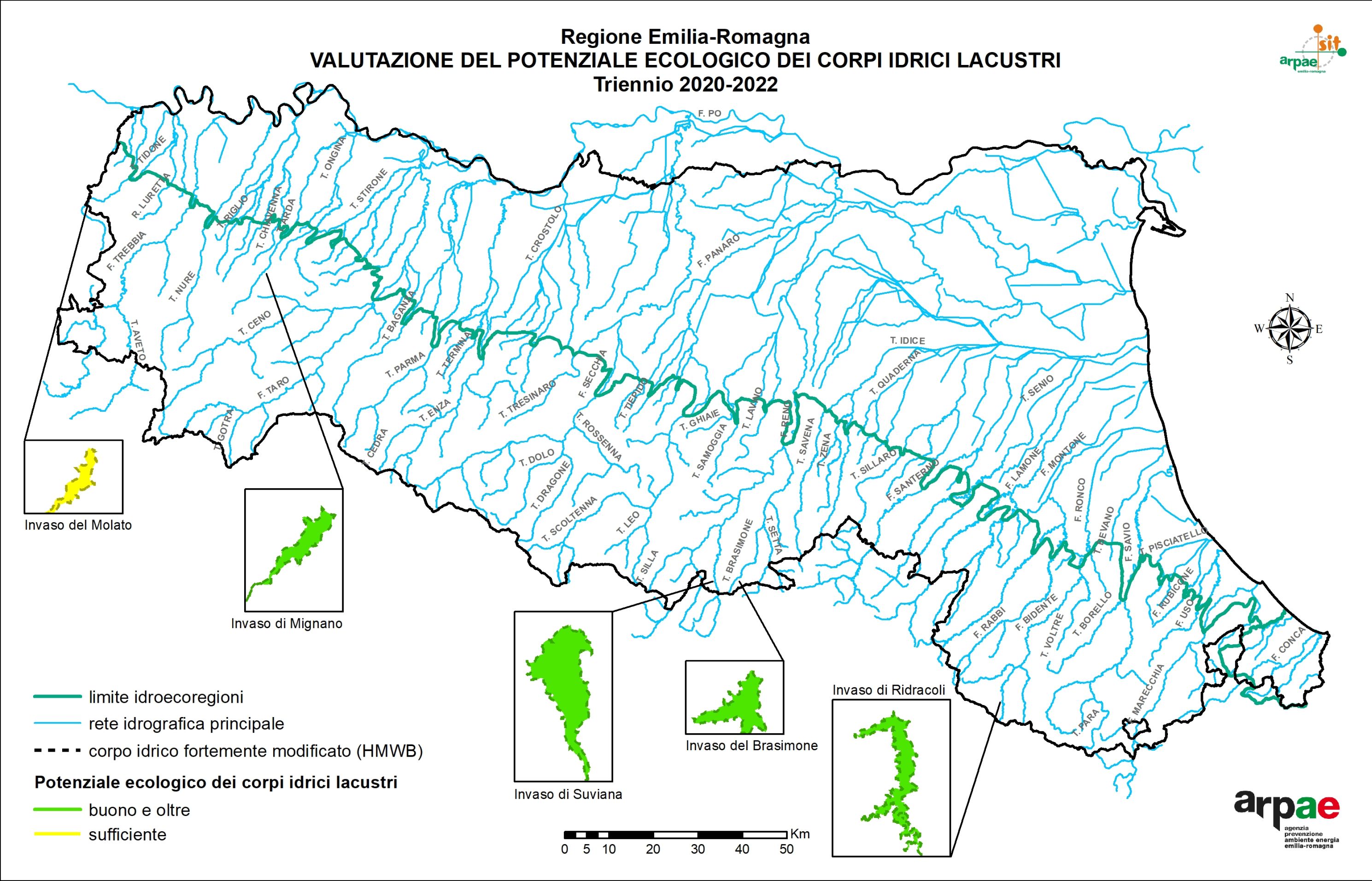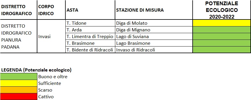 Distribuzione territoriale della valutazione dello Stato/Potenziale ecologico dei corpi idrici lacustri (invasi) (2020÷2022)