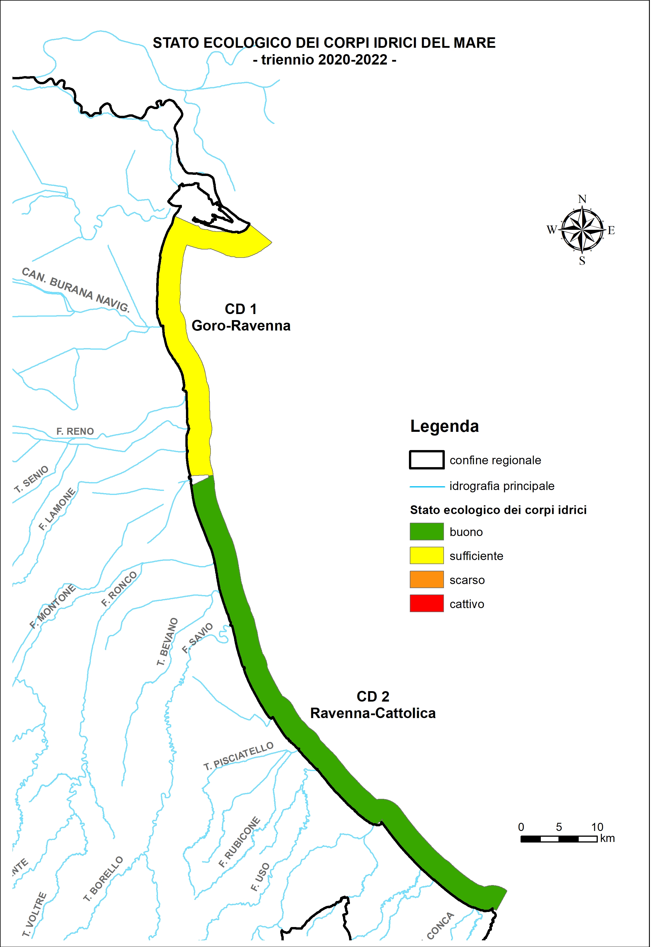 Rappresentazione territoriale dello stato ecologico delle acque marino costiere (triennio 2020-2022)