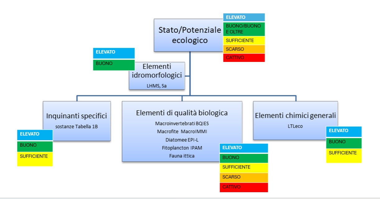 Lo “stato ecologico” delle acque superficiali è espressione della qualità della struttura e del funzionamento degli ecosistemi acquatici a essi associati e può essere espresso da cinque classi di qualità (elevato, buono, sufficiente, scarso, cattivo), che rappresentano un progressivo allontanamento dalle condizioni di riferimento corrispondenti allo stato indisturbato. Lo stato di qualità ecologica è valutato sulla base della qualità degli elementi Biologici (EQB), fisico-chimici e dell’ idromorfologia a supporto degli elementi biologici. Per i corpi idrici fortemente modificati e artificiali, sono stati recentemente definiti i parametri correttivi per le condizioni di riferimento della maggior parte degli elementi biologici e pertanto non sarà definito lo “Stato” Ecologico, bensì il “Potenziale” Ecologico.