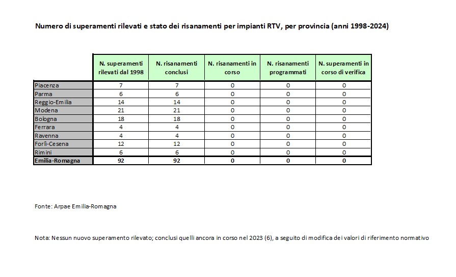 N. di superamenti rilevati e stato dei risanamenti per impianti RTV, per provincia (anni 1998÷2024)