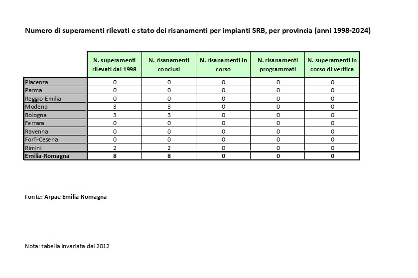 N. di superamenti rilevati e stato dei risanamenti per impianti SRB, per provincia (anni 1998÷2024)