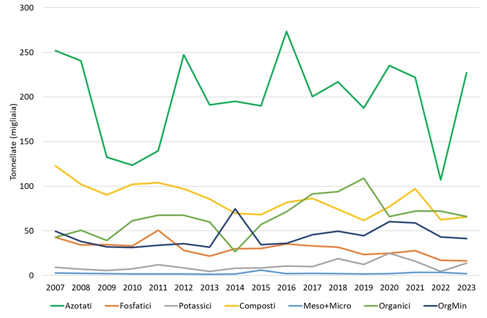 Quantitativi di concimi commercializzati in Emilia-Romagna, per categoria (2007-2023)