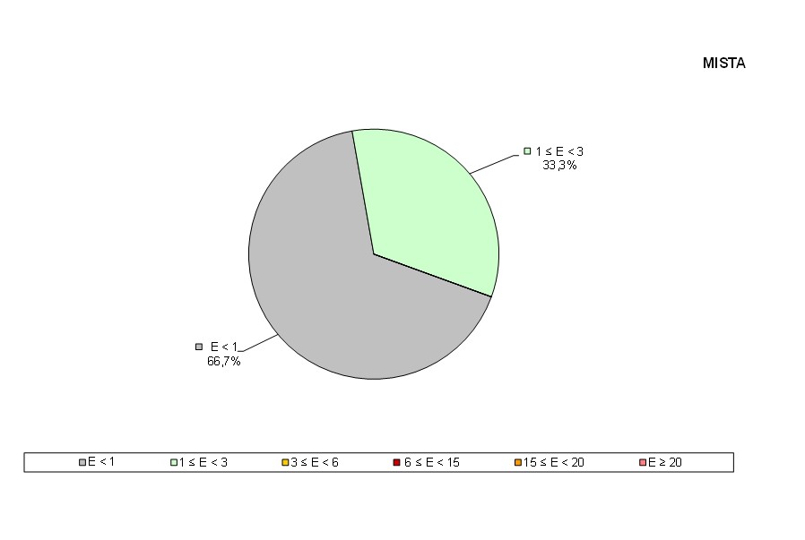 Distribuzione % valori massimi (medie su sei minuti) di E (V/m) misurato in continuo, in prossimità siti MISTI (2015)
