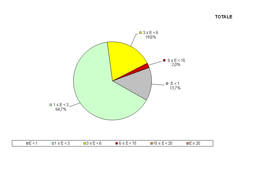In figura 1 sono riportate le distribuzioni per classi di valori e tipologia impianti con dettaglio provinciale, nelle figure 2a/b/c/d, invece, è rappresentata la distribuzione percentuale, a livello regionale, per classi di valori, rispettivamente di tutte le campagne di monitoraggio nel complesso, di quelle relative a siti SRB, RTV e siti misti. I dati di dettaglio sono disponibili nella sezione “Download grafici e tabelle”.